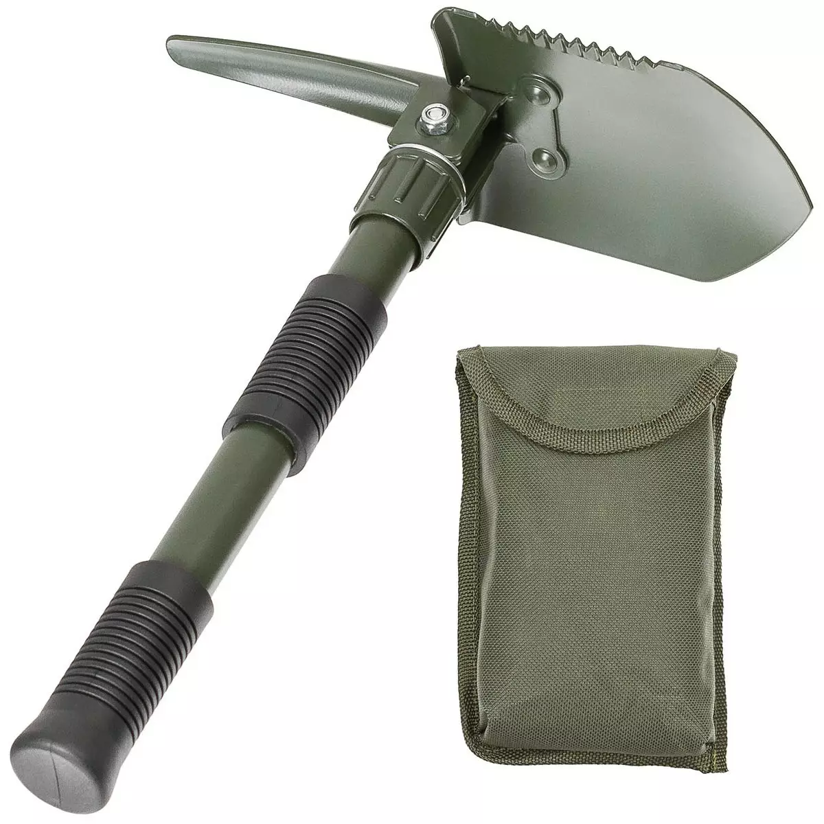Shovel - Axe Tool, 3 in 1, Olive Green, MFH. This shovel-ax combination tool features a two-piece collapsible handle. It can be utilized as a shovel, saw, or axe. It compacts to a very small size, making it easy to carry in your truck or car.