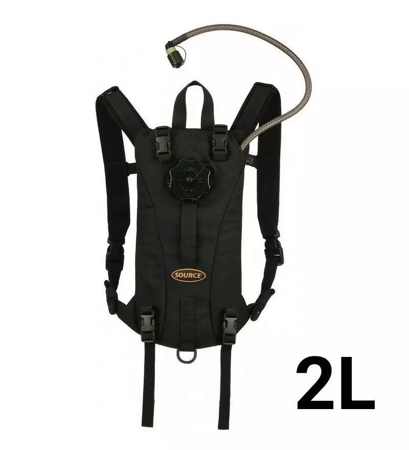 Source Tactical hydration pack with reservoir, 2L, black. The Source Tactical pack contains a 2L WXP™ hydration reservoir, boasting a sturdy three-layer construction and a glass-like™; Taste-Free™ Grunge-Guard™ bacterial resistant treatment. The reservoir features a leak-proof wide-mouth opening for easy filling and QMT™ quick-connect fittings. Additionally, it includes a threaded fill port. The reservoir can also be effortlessly filled with the UTA™ adapter. The valve and hose can be detached without leakage. The pack includes a lightweight adjustable carrying system. The shoulder straps have a Velcro loop for the reservoir hose and a sternum strap. The shoulder straps can be removed and stowed inside the pack, allowing you to attach the reservoir neatly to your backpack or vests. There is a zipper on the back of the pack, making it easy to remove the reservoir when needed.