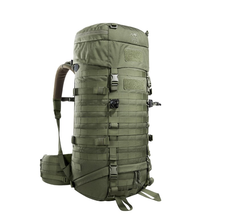 Tasmanian Tiger Base Pack 52 Backpack, Olive Green. The Tasmanian Tiger 52-65 liter backpack features an incredible amount of MOLLE webbing, making it perfect for extended journeys. Its unique carrying system ensures the pack is remarkably light to carry, with weight distributed exactly where it should be on your body. The backpack includes a large main compartment with a rolltop closure, and below it, a smaller zippered compartment. Between the main compartment and the smaller pocket, there is a zippered divider that you can open to access the entire interior length of the pack. The top of the main compartment features an adjustable lid, allowing for ample overpacking. On the lid, there is a full-sized zippered pocket, along with an additional zippered pocket for first aid supplies. The lid also has MOLLE webbing (4 x 6) and a patch area on the front for attaching your favorite insignia, like the Finnish flag. Additionally, the front and both sides are lined with extensive MOLLE webbing, allowing you to attach virtually any pouch you need. On the upper sides, there are openings for hydration reservoir tubes, and a designated pocket for a hydration reservoir equipped with a suspension loop in the main compartment. The pack comes with the V2 Plus System carrying system, offering excellent adjustability for individuals of varying heights and builds. The hip belt is very well-padded, and the top of the carrying system features a robust carry/grab handle.