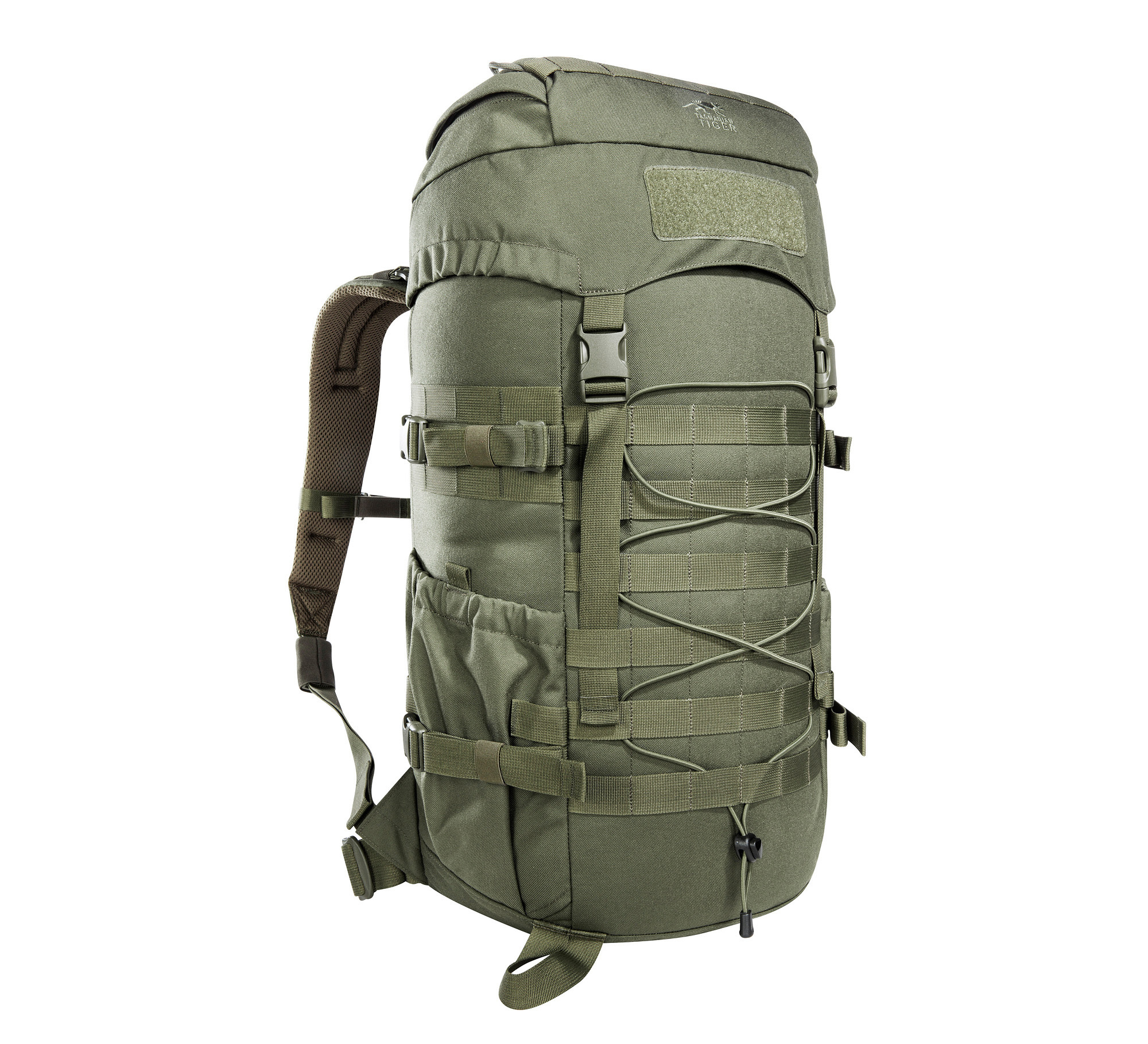 Tasmanian Tiger Mil OPS Pack 30, olive green. A 30-liter backpack from Tasmanian Tiger designed for everyday use. Ideal size for a daypack, equipped with ample molle webbing to attach additional pouches as needed. The top flap features two zippered pockets—one on the outside and one on the inside. The flap also includes a molle panel, 5 wide and 4 high. The corners have attachment points to secure items like a sleeping mat easily. Inside the large main compartment, there’s a pocket for a hydration bladder, with hose exits on both upper corners of the pack. The main compartment closes with a traditional drawstring top. It can be compressed further with a compression strap over the top. The front of the pack features a molle webbing system, 6x6, and also on the sides, 4x2. The molle area on the front comes with a pre-installed shock cord netting, perfect for securing gear like jackets or rain gear, preventing them from taking up extra space inside the pack. The netting can also be used to dry wet equipment. The shoulder straps are attached at the bottom with buckle closures, protected by a stretch fabric flap to prevent accidental releases. Buckle closures provide quick and easy removal of the pack when needed. The shoulder straps come with a built-in chest strap that features an elastic band. Additionally, there’s a short adjustable waist strap with a buckle.