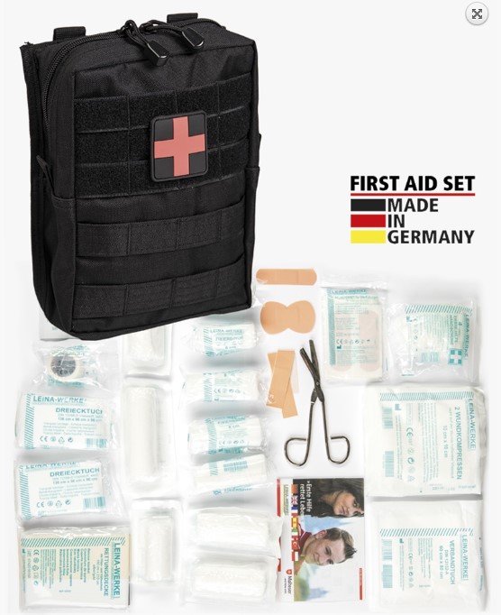 First Aid Kit 43-Piece, Leina, Mil-Tec. This first aid kit is packed with a solid amount of supplies for emergencies. It comes in a Mil-Tec MOLLE pouch, making it easy to attach to your backpack.