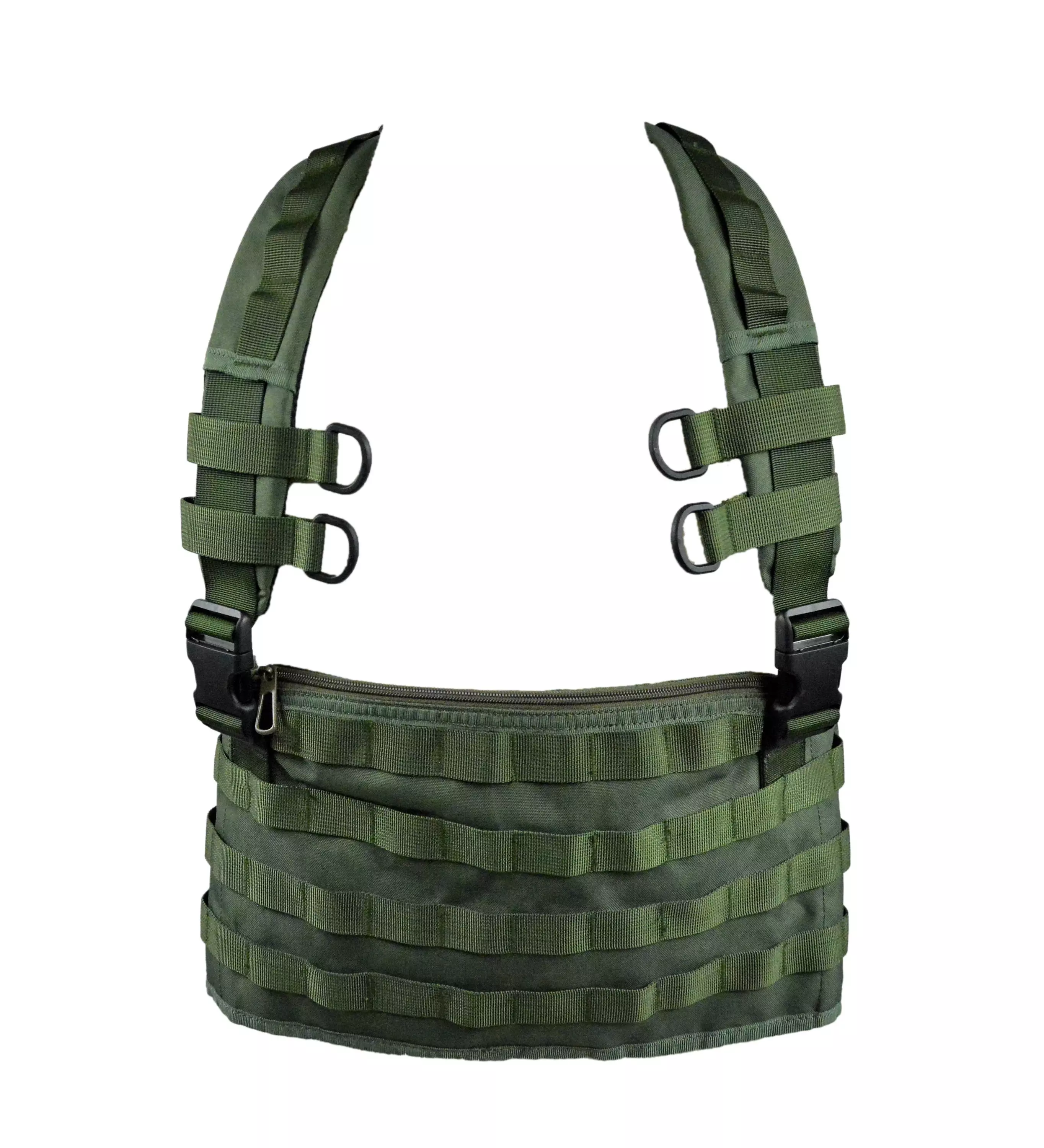 Dutch Chest Rig, Olive Green, Surplus. Used Dutch chest rig featuring ample MOLLE webbing on the front to attach PALS-equipped pouches. Adjustable straps cross at the back and secure at the front with a robust plastic buckle. The straps have 4 D-rings on the front. You can attach magazine pouches or whatever you need. The rig includes a large zippered admin pocket beneath the webbing. Ideal for tactical activities, fishing, or any outdoor venture. Lightweight and made from sturdy fabric.