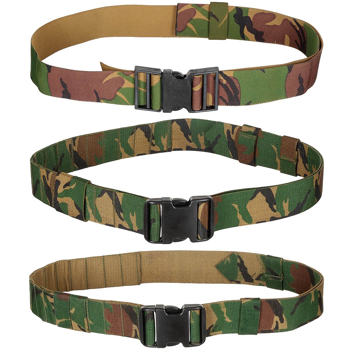 Dutch Combat Belt DPM, surplus. Simplicity is beautiful! This Dutch Army combat belt features a DPM (Disruptive Pattern Material) camouflage and a sturdy plastic buckle. Its adjustable design fits up to nearly 140 cm, eliminating the hassle of choosing from various sizes! Note that there may be different models with varying buckle designs. It also has channels for Alice-style pouches on one side. The belt is not overly stiff, making it suitable even as a regular pants belt.