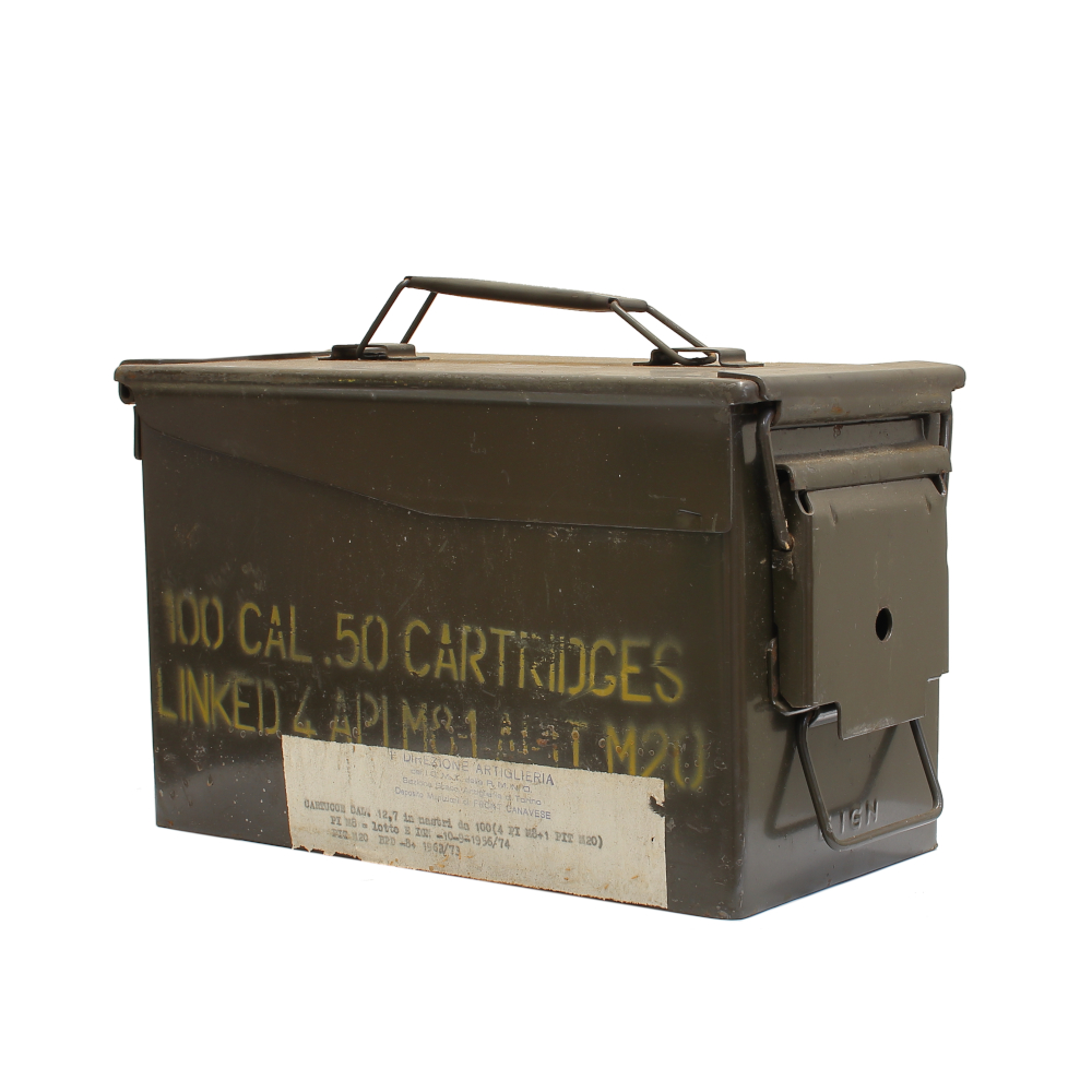 NATO Army Original 50.cal Ammo Boxes. These boxes have contained various types of ammunition such as flare rounds, cal 5.56 / .223, etc. An excellent storage box for ammunition. These ammo boxes can also be repurposed into small grills, speakers, etc. You can fill the box with concrete or rocks, providing a good weight for nets. (They are also quite suitable as weights for larger tents).