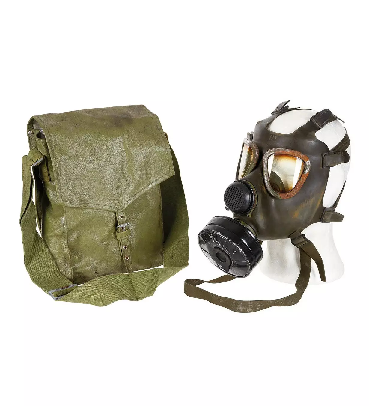 This gas mask is crafted from olive-green chemically resistant neoprene rubber. It features two triangular rounded lenses, also known as oculars, and a round breathing valve. Additionally, it has an exhalation port that prevents fogging of the mask. It comes with a STANAG 4155 threaded gas cartridge connector. The mask includes a carrying bag and a filter. These gas masks are sold for collection and decorative purposes and should not be used for their original intended purpose. Contains no asbestos.