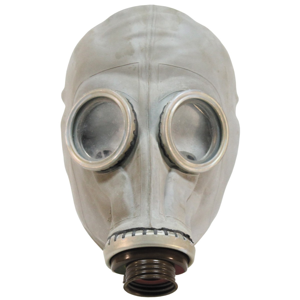 Soviet GP-5 Gas Mask, Surplus. The GP-5 ("Civilian Gas Mask") was produced by the Soviet Union from 1962 to 1990 for civil defense storage and use. The gas mask is based on the ShM-41, which itself was originally the ShM-62, replaced by the ShM-62u. Updated versions of the ShM-62 are the ShM-66mu and PMK-G. The GP-5 was designed to protect Soviet civilians from radioactive fallout during the Cold War. This "mask" is a "helmet"-type mask made of white rubber. The mask's lenses are held in place by pressed metal frames that are compressed into the mask's rubber. The mask features a metal hose connector with a 40 mm filter inlet, as well as inhalation and exhalation valve assemblies. Air enters through the inhalation valve and flows into the mask through Tissot tubes under the lenses and is exhaled through the exhalation valve. The lenses tend to fog easily, and anti-fog inserts were originally included with this series.