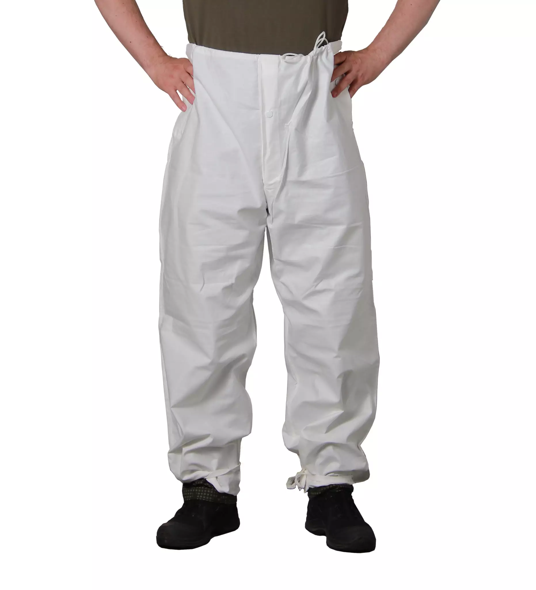 Swedish snow suit trousers, surplus. A distinctive take on snow suit trousers by the Swedes. These all-white outer trousers are made from cotton or a cotton blend. Some trousers feature openings for access to the side pockets of lower layers, while others do not. Selection is random. The waistband includes traditional drawstring tightening. The ankles feature drawstrings that can be tightened for extra snow protection. The drawstrings are standard, so suspenders may be necessary for optimal comfort and fit.