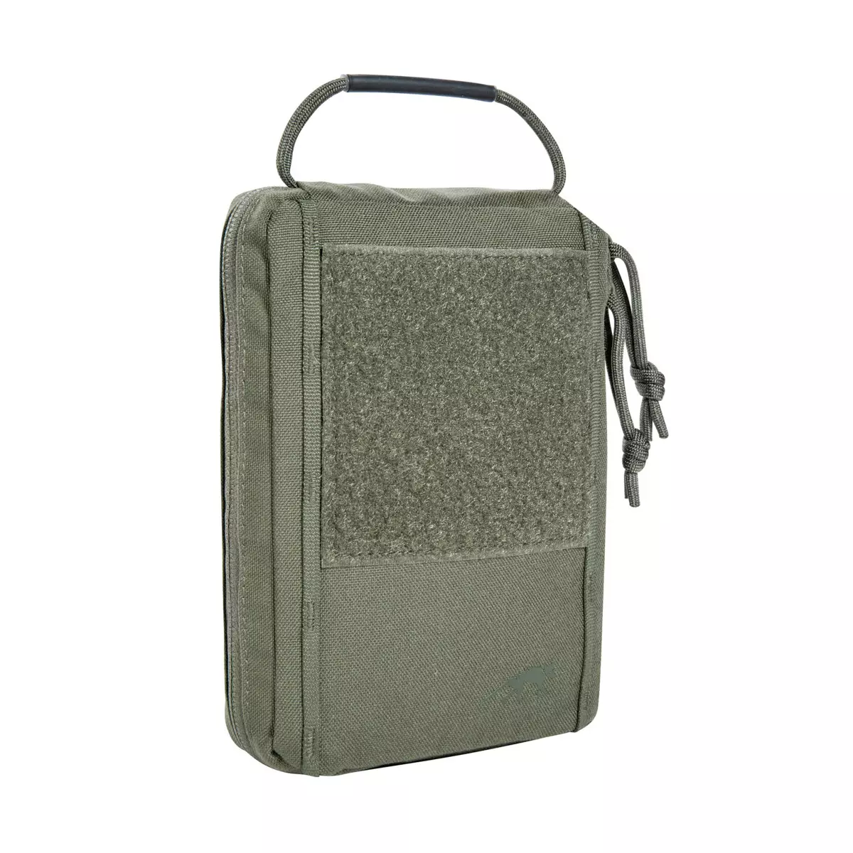 Tasmanian Tiger Notebook Pocket MKII, Olive Green. This versatile notebook pocket is designed to hold a variety of writing instruments and small essentials. It fits perfectly in your trousers' thigh pocket or backpack, offering easy access when you need it most. The top features a handy pull tab, and inside you'll find ample space with numerous smaller pockets and pen slots. Additionally, there's a Velcro patch on the front to attach your preferred insignia. The pocket features a zipper around the perimeter, allowing for full opening (see image).