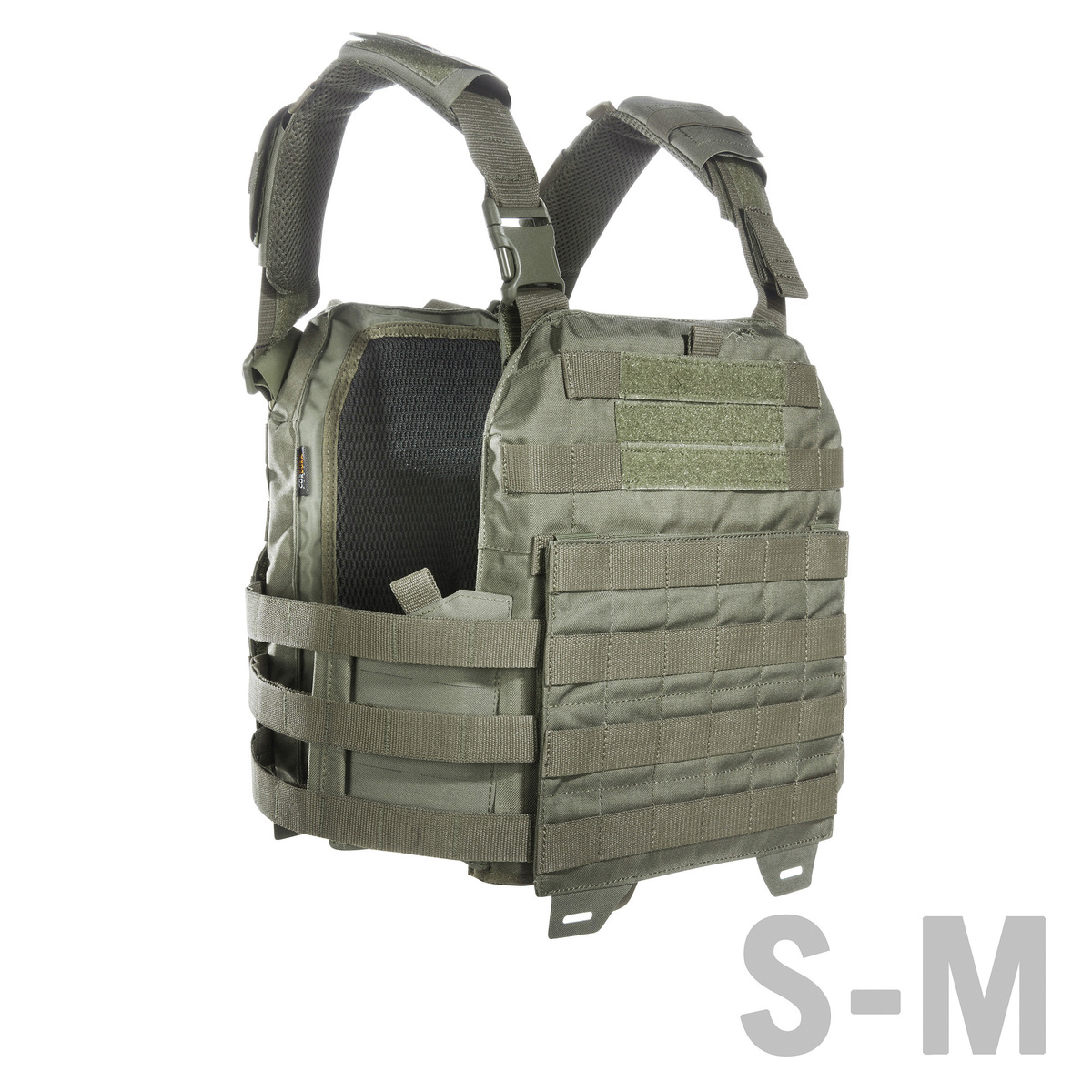 Tasmanian Tiger Plate Carrier MKIV. A lightweight plate carrier featuring a DROP SYSTEM and detachable front panel. The Drop System allows you to customize your vest with a handle for quick removal with a single pull. The S/M size fits SAPI plates measuring 30 x 25 cm, while L/XL accommodates plates ranging from 30 x 25 cm to 34 x 33 cm. The adjustment options are extensive, and donning the vest is easy thanks to the quick-release buckle on the other shoulder strap. The side lengths are also adjustable, fitting various body types. Ventilation has been enhanced on the sides. The comprehensive MOLLE webbing gives you the flexibility to expand with pouches tailored to your needs. Two detachable radio pouches are included, attached to the vest's side panels.