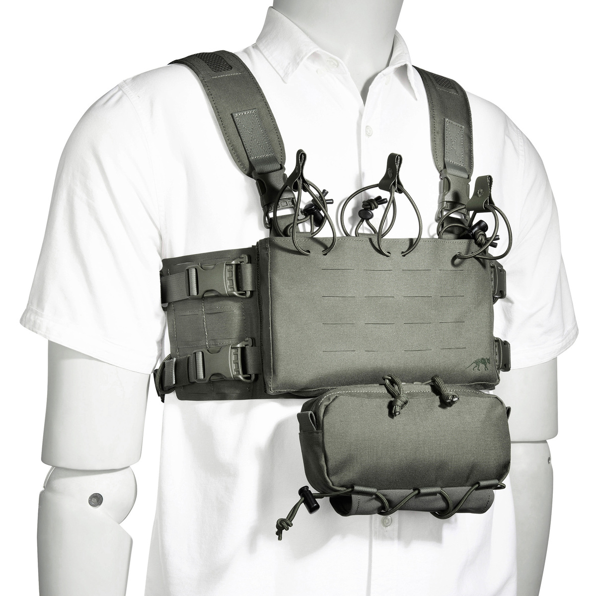 Tasmanian Tiger Small Combi Rig. Now you can say that small is beautiful! The Tasmanian Tiger Small Combi Rig is incredibly light and handy, boasting multiple smart features. Proper adjustments ensure a great fit. The adjustable large magazine panel can be modified with dividers to accommodate various magazine types. For example, it can hold 3 x M4 magazines or 4 x pistol magazines. Included are divider accessories for G36 or HK417 magazines. The magazine panel utilizes Velcro fastening, allowing you to easily transfer it to your plate carrier. Removable MOLLE side panels provide extra space. The utility pouch is also detachable and can be moved onto the plate carrier with ease thanks to its Velcro fastening.