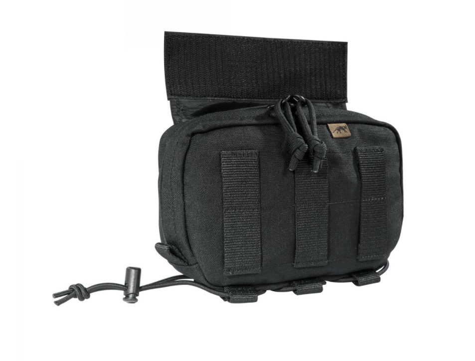 Tasmanian Tiger Tac Pouch 12, Black. The Tasmanian Tiger utility pouch, also known as the “belly pouch”, fits seamlessly between a plate carrier and a tactical belt. It easily attaches to the Velcro flap of the plate carrier's plate pocket and remains secure during active movement. The pouch features a zippered closure, elastic straps inside to keep your gear in place, and a zippered mesh pocket.