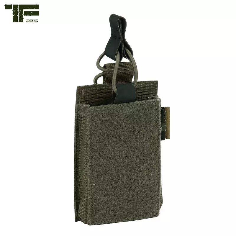 TF-2215 Single Magazine Pouch for M4, Ranger Green. Constructed from durable 500 denier Cordura, this M4 magazine pouch accommodates a single magazine. The pouch features full hook-and-loop coverage—with a front made for loop and a back equipped with hook Velcro. This design allows for easy attachment to plate carriers or bags that have soft loop Velcro surfaces. A flexible Hypalon retention strap keeps your magazine secure. This magazine pouch is exceptionally lightweight and slim.