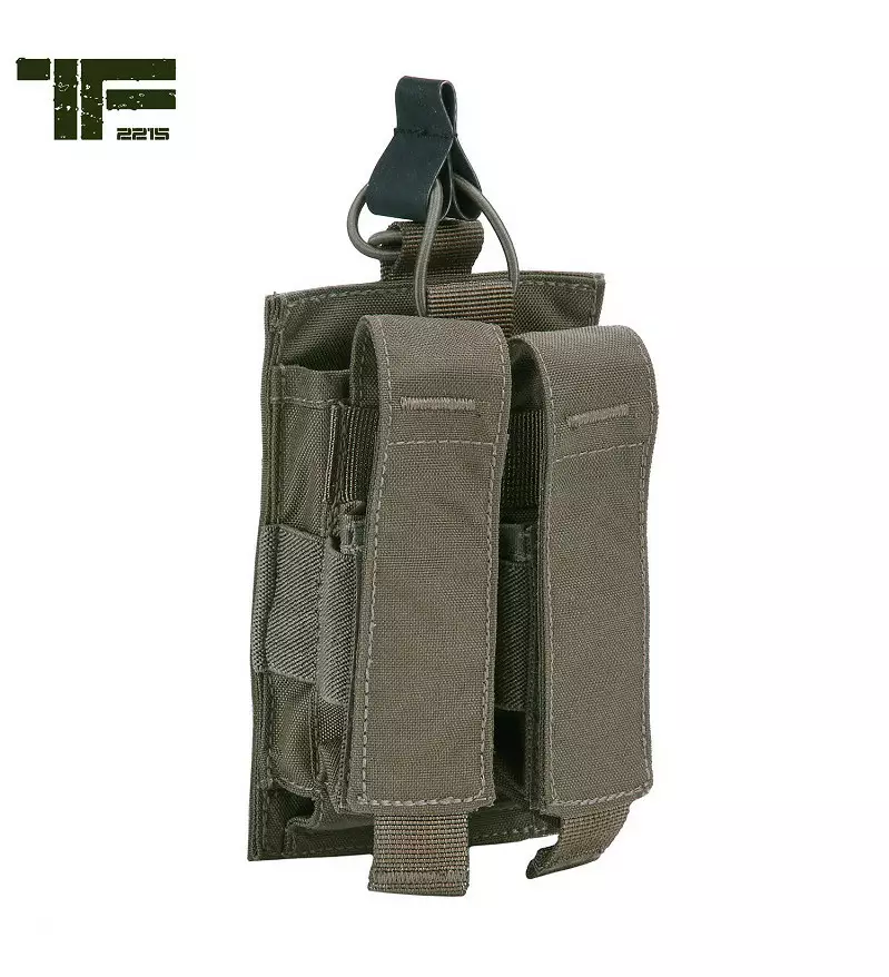 TF-2215 Double Magazine Pouch for M4/AK/Pistol, Ranger Green. This pouch holds one rifle-caliber magazine and two pistol magazines.