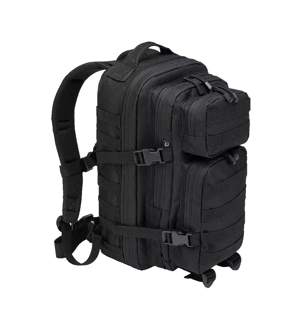 Brandit Assault Pack, Small, Black. The Brandit Assault Pack is perfect for daily use and hiking. It features one large main compartment with two smaller pockets inside for all your essential items. On the back, there's a large Velcro-secured compartment suitable for a hydration bladder or even a small laptop or tablet. Behind the main compartment is another sizable pocket with smaller internal pockets. Additionally, there are two smaller surface-mounted pockets at the front; the smaller one lacks internal compartments, while the larger includes slots for notebooks and pens. The pack is constructed from durable thick nylon coated with PVC, providing decent moisture resistance, although it is not completely waterproof. All compartments are secured with zippers except for the hydration bladder pocket at the back. The pack includes ample adjustment straps and Molle webbing (modular system) to attach various gear and separate Molle pouches.
