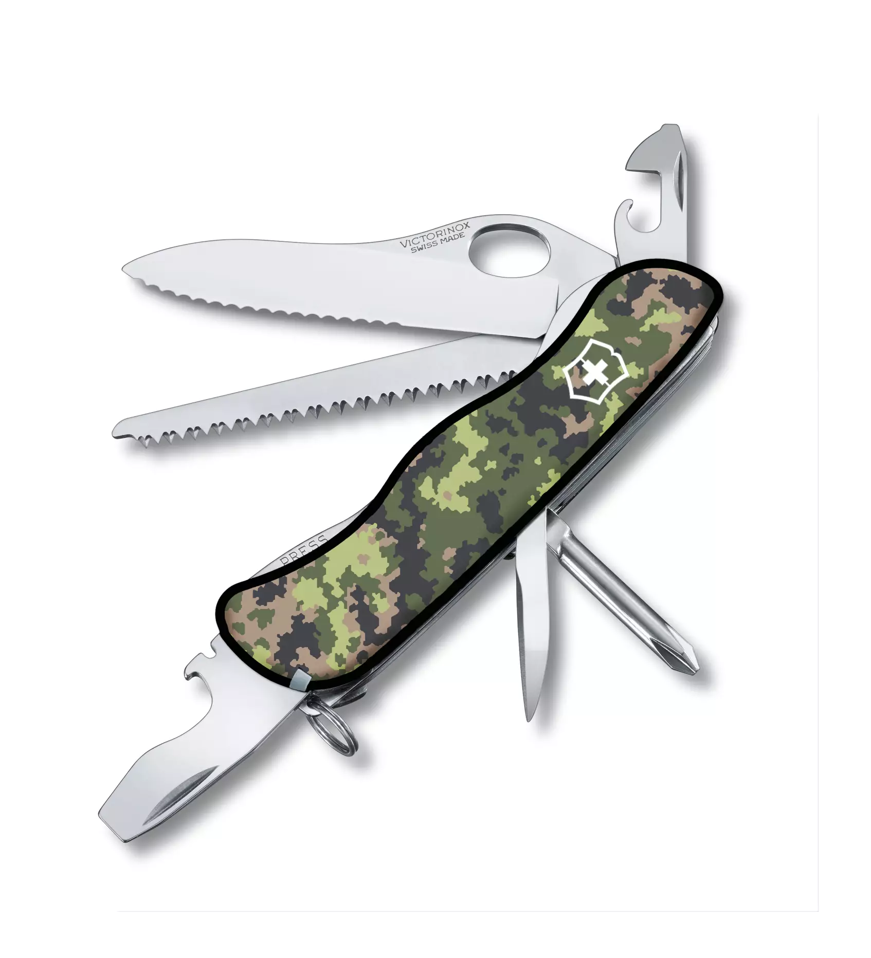 Multi-tool Victorinox Trailmaster M05. The Trailmaster M05 is inspired by the official camouflage pattern of the Finnish Defense Forces M05. This rugged 111 mm folding knife features a one-handed opening, locking main blade. The front edge is serrated, ideal for cutting rope, among other tasks. This model is available exclusively in Finland.