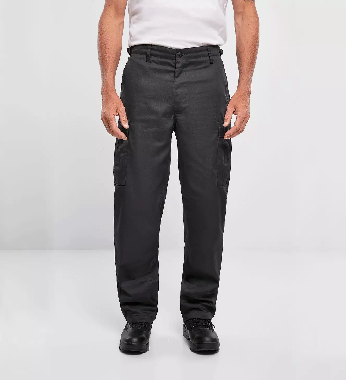Brandit US Ranger Tactical Cargo Pants, Black. Affordable, durable black cargo pants made from a robust blended fabric, featuring multiple pockets and a secure button-fly closure. These pants are equipped with side pockets, flap-buttoned cargo pockets, and rear pockets, perfect for carrying all the essentials. The waistband includes 50mm wide belt loops, and the fly closes with buttons for added security. Adjustable cuffs with drawstrings offer a customizable fit. The fabric is wear-resistant, making it ideal for rugged outdoor adventures.